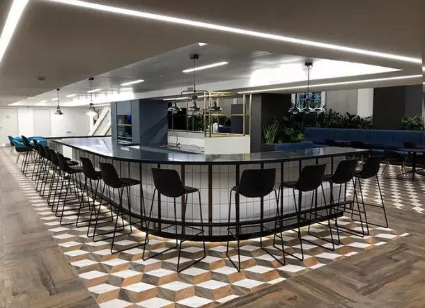 - Comptoirs sur mesure : véritables pièces maîtresses qui structurent l’espace et accueillent les clients.