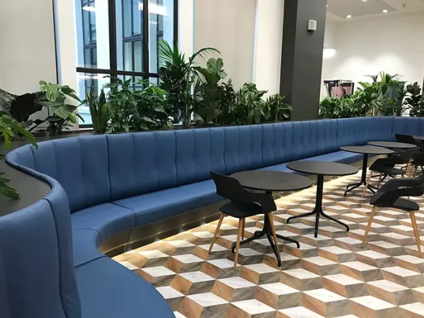 - Banques d’accueil, comptoirs et mobiliers intégrés parfaitement adaptés aux contraintes architecturales.
