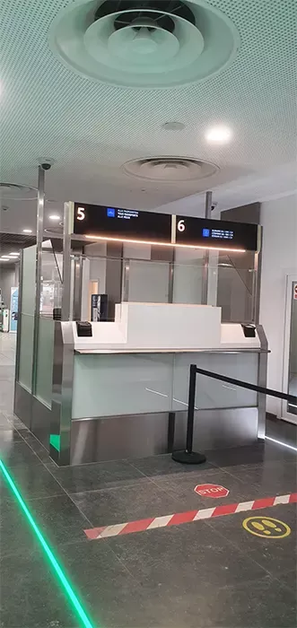 • Habillages inox : Utilisation d’inox 304 brossé (grain 220, finition humide), collé sur des panneaux en bois hydrofuge de 16 mm d’épaisseur pour une meilleure durabilité et résistance en environnement aéroportuaire.